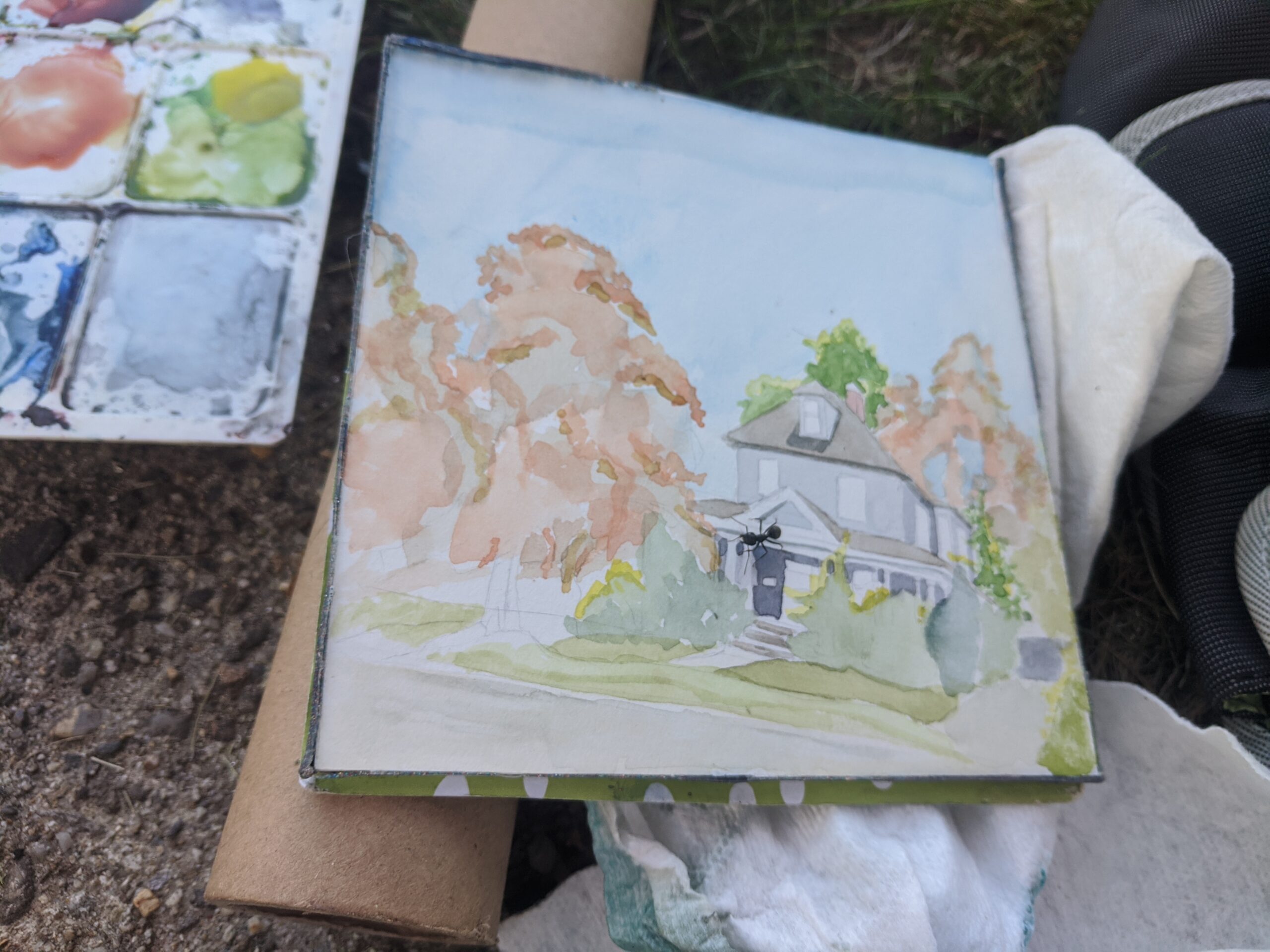 The very first painting of the series, this house caught my eye in various physical therapy walks from my house because it was about a quarter mile from my house, or a 10 minute walk. I needed to walk for 10 minutes, and then take a break, so I did, and painted this grand structure. Things were just beginning to set full leaves, so the leaves of the last warm season were still present on the sidewalks of those who procrastinate. When wet from spring rains, the moisture and decay become a banana peel lubricant.