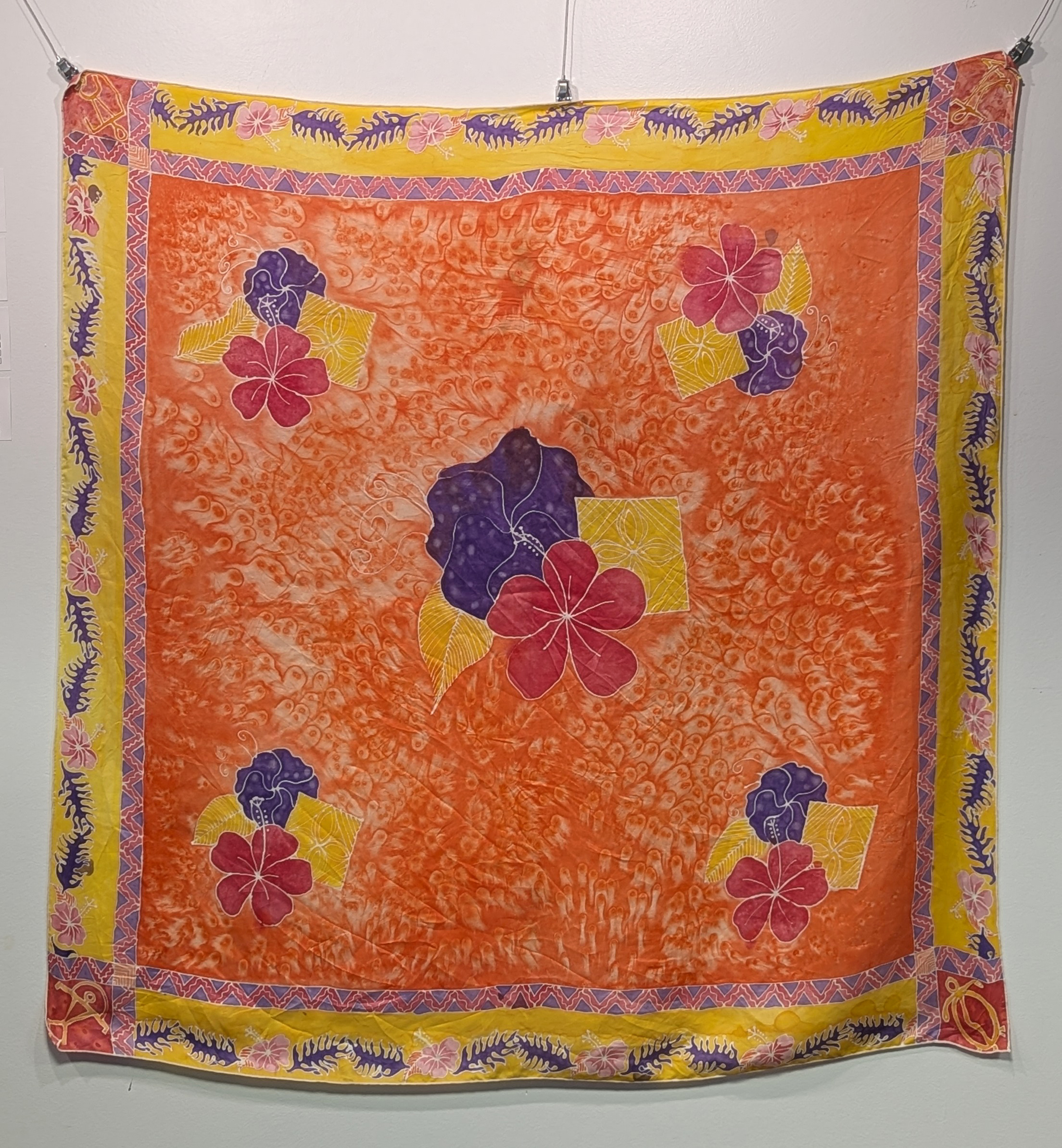 A luxurious feeling thick silk purchased at specialty fabric shop, G Street outside Washington DC. A large mostly orange silk scarf with hibiscus and Hawaiian glyphs based on a childhood growing up on Hickam Air Force Base in Honolulu, Hawaii.